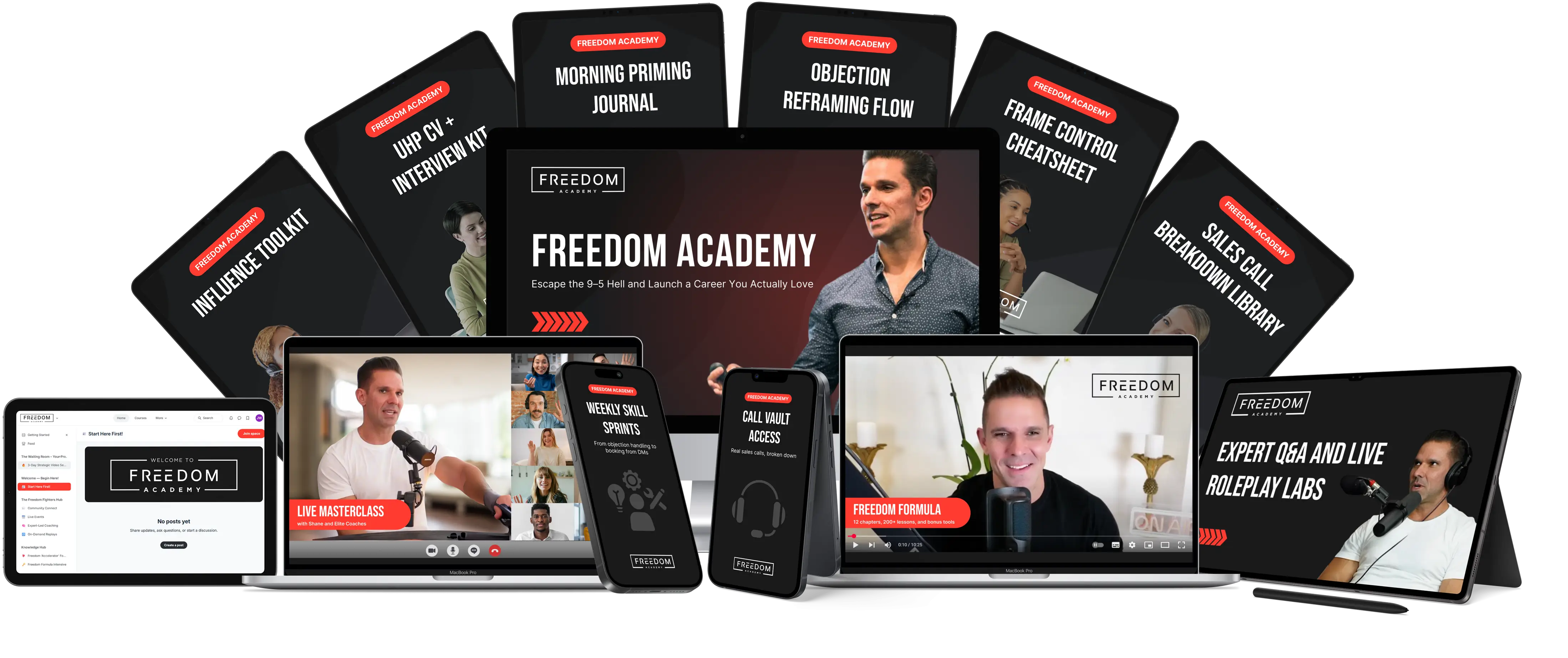 Inside, you’ll get access to our full Freedom Formula™ Curriculum — 12 chapters, 200+ lessons, and bonus tools designed to rewire your identity, build world-class sales skills, and position you for $10K–$30K/month roles.